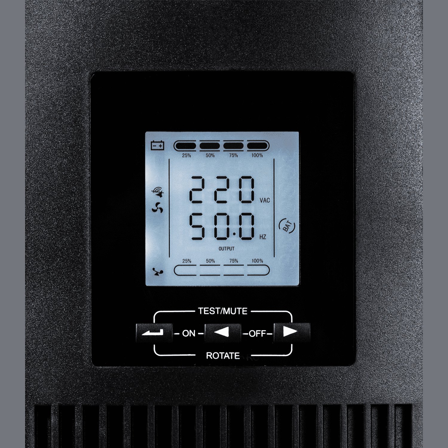 • Жидкокристаллический дисплей показывает режим работы, входное/выходное напряжение и частоту, мощность нагрузки, температуру, заряд батарей, данные о неисправности